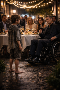 His feet were narrow, the bones delicate and too visible beneath the skin. The patio heaters cast gold over him but did nothing to warm the flagstones, which had been washed and polished for the benefit of people who never noticed what supported them. He wore black trousers slightly too short at the ankle and a white dress shirt with the sleeves rolled back as if he had borrowed it or stolen it or simply refused the costume of vulnerability someone had once assigned him. His hair, dark and unevenly cut, fell over his forehead in a way that made him look younger than he was until he raised his face and you saw that his expression belonged to no child anyone at that party had ever bothered to understand.