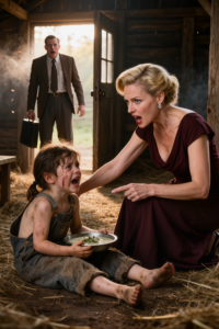 It moved only in the shape of her mouth, in the tremor of her chin, in the pleading collapse of her shoulders. It lived in the wet shine of her eyes and in the small, exhausted recoil of her body from the plate set before her on the floor. The old storehouse was damp with the slow, animal smell of mildew and stale straw. A thin band of evening light entered through a warped plank in the wall and cut across the room like a blade, turning the dust into drifting gold. Everything else was shadow: the rusted gardening tools hanging from nails, the sacks of fertilizer slumped in a corner, the cracked buckets, the old wooden chest with its split lid. The room felt less like a place where objects were kept and more like a place where shame was stored, stacked up year after year until it acquired its own odor.