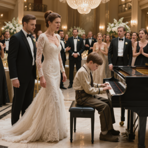 At 8:17 p.m., the champagne tower still sparkled untouched near the east wall. The custom place cards were still aligned like a military operation disguised as elegance. The hotel staff still moved through the space with polished invisibility, all black uniforms and lowered voices. The string quartet had already given way to a soft, live piano performance near the front of the room, where an eight-year-old boy in a small black suit sat on the bench with his feet not quite touching the floor.